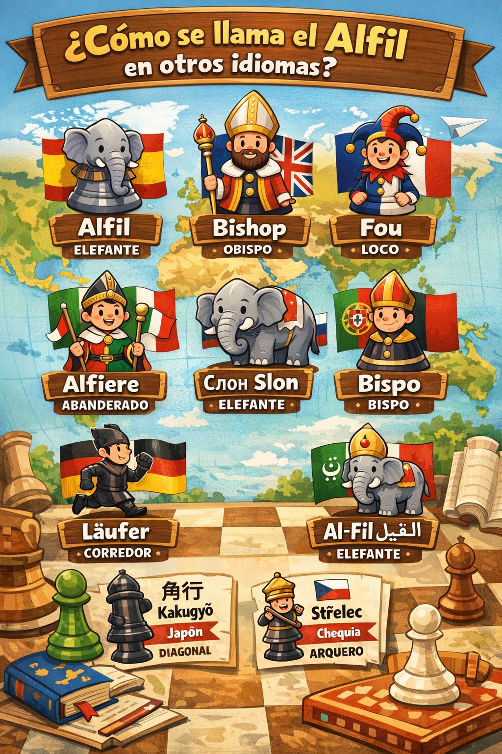 El ajedrez es un idioma universal… pero no del todo. Aunque el tablero es el mismo, las piezas tienen nombres distintos según el país. Uno de los más fascinantes es el alfil, esa pieza que se mueve en diagonal y parece tener un pasado misterioso. Su nombre varía tanto que parece un espía internacional. ¡Acompáñanos en este viaje por los idiomas del mundo!